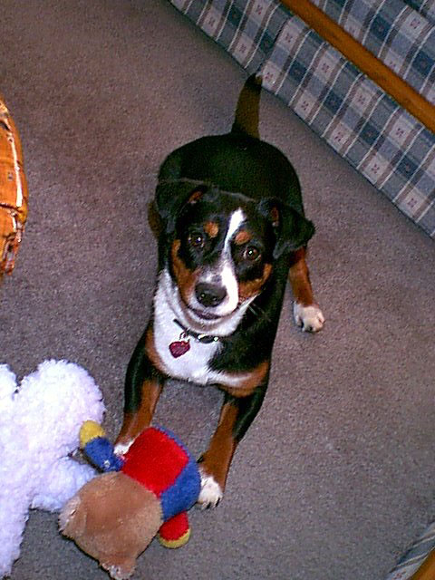 Back down at the intersection, Kathy gave her some water, and she gulped down almost an entire 16 oz. bottle of it. She then got comfortable in Kathy's jacket and slept almost the entire 1.5 hour ride home. She handled riding in the car with ease, though we knew a part of it must have been due to exhaustion. When she was awake she had a very sweet disposition, but we had no idea what breed or mix she may be other than perhaps Corgi or Beagle, as she had short legs proportionate to her body, and was tricolor with black, brown and white. She looked by appearances to be in good shape physically, and although her breath was a little on the foul side, she appeared to have good teeth and no skin or coat problems that we could tell, just wet and dirty. When we arrived home, we were careful with the introductions, but the dog wasn't at all aggressive towards our other dog, an 11-year old Shi-Tzu/Poodle mix named Peaches, or even our guinea pig, Jasper (who we had rescued from apparent abandonment almost a year earlier when Peaches found it wandering outside our apartment one night... but that's another story). I gave her a bath and scrubbed her good, noticing that she had firm muscles and no cuts, scars or lumps. She didn't care for the bath, of course, but wasn't overly fearful of it either. After she was dried off, we fed her and she ate like there was no tomorrow (another indication that she probably hadn't had a good meal in quite a while). She was adorable, and actually acted like she had been raised in our home, it seemed, “plopping” herself on the couch next to us and giving an audible sigh (of relieve perhaps?) as she lay her head down after her meal. Later, she explored the apartment and was curious as to what this “guinea pig thing” was, but was not aggressive towards it, Peaches, or us. Not even once. |